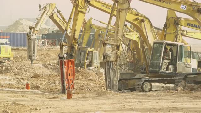 > Diggers break up concrete on a construction site, Riyadh, Saudi Arabia.
