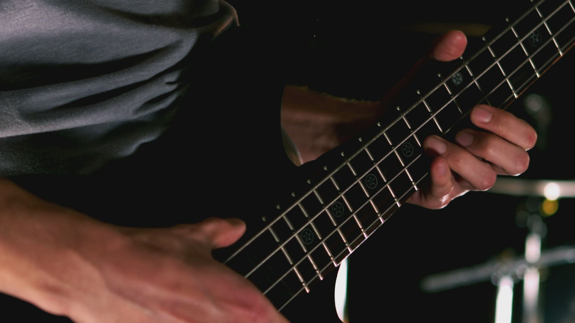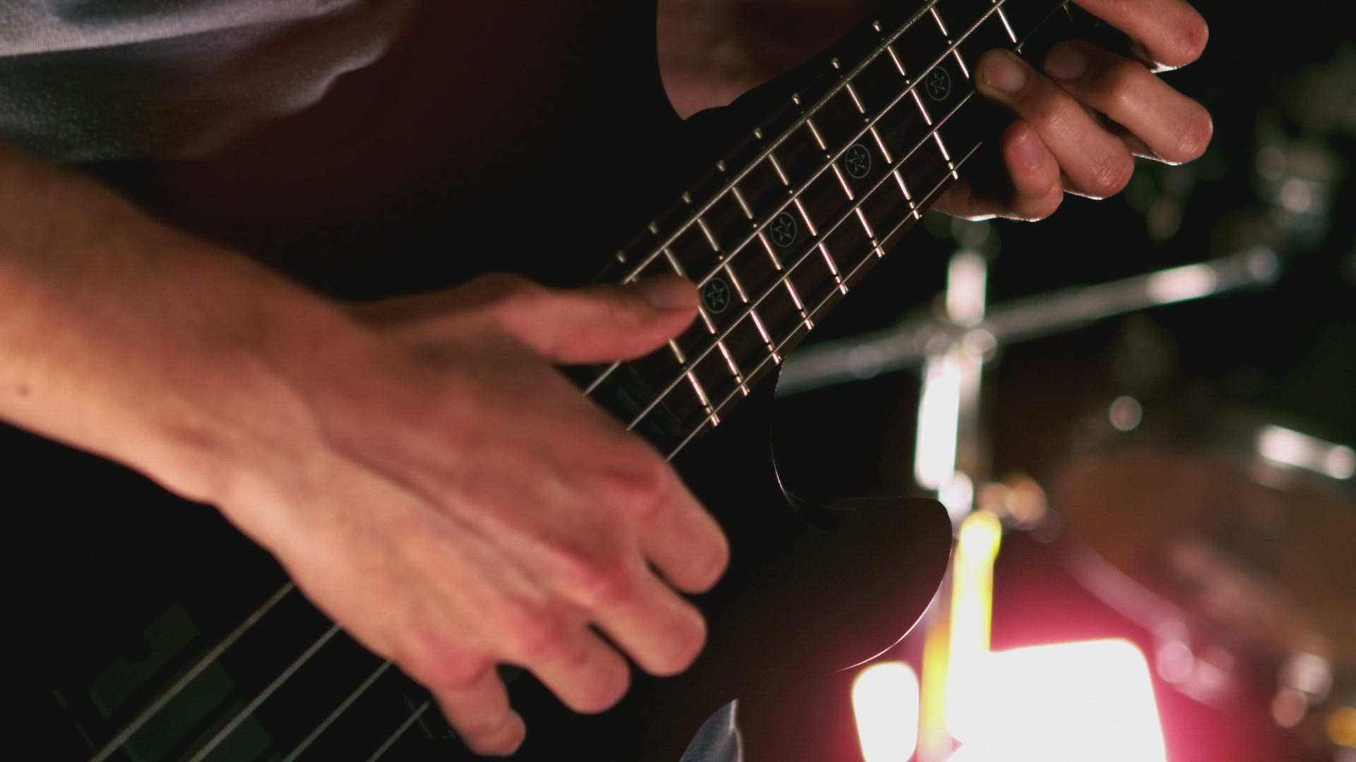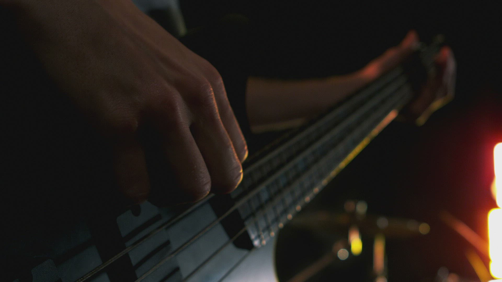 Handheld closeup A Latino bassist plays with a guitar head in the foreground.