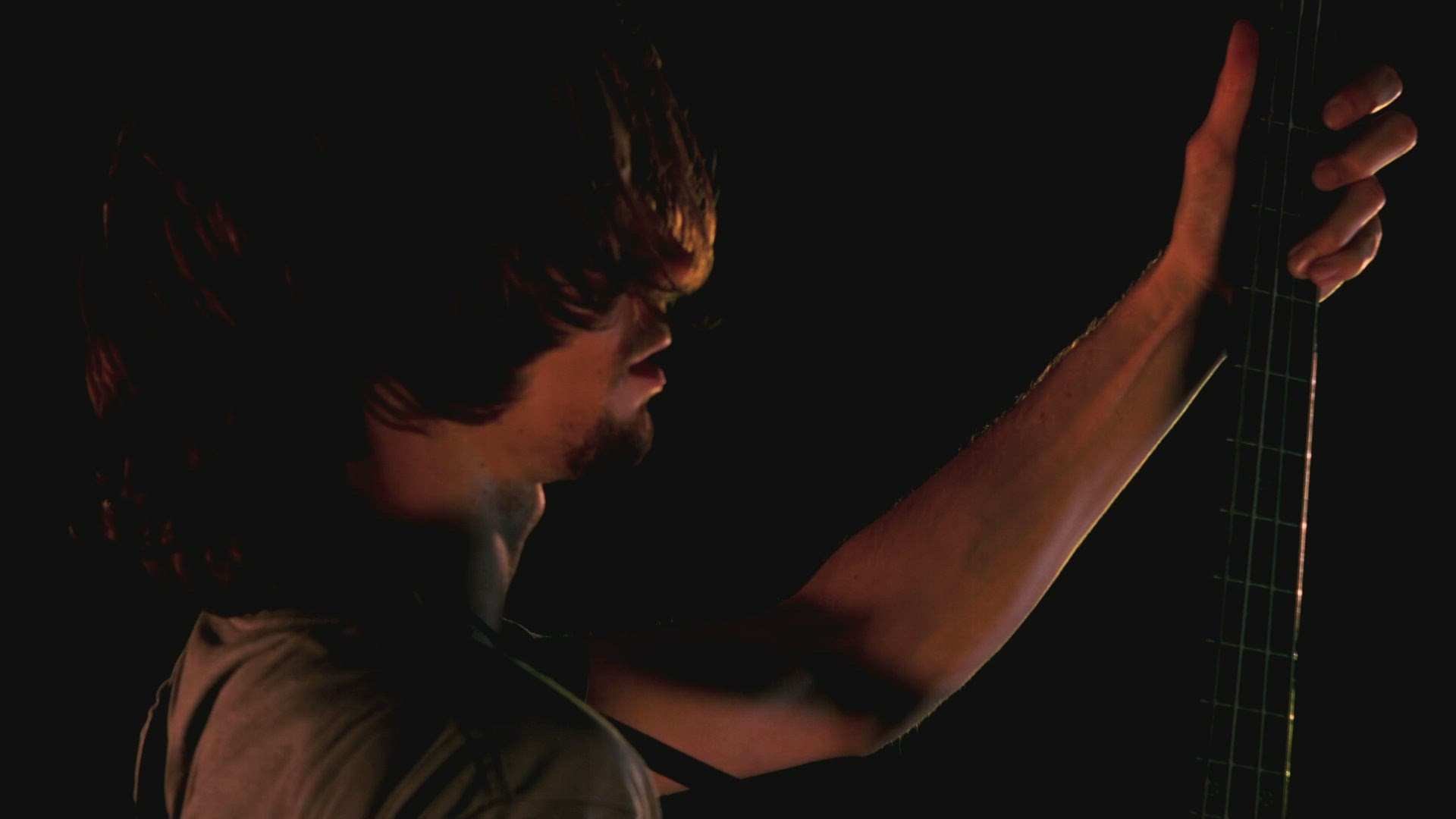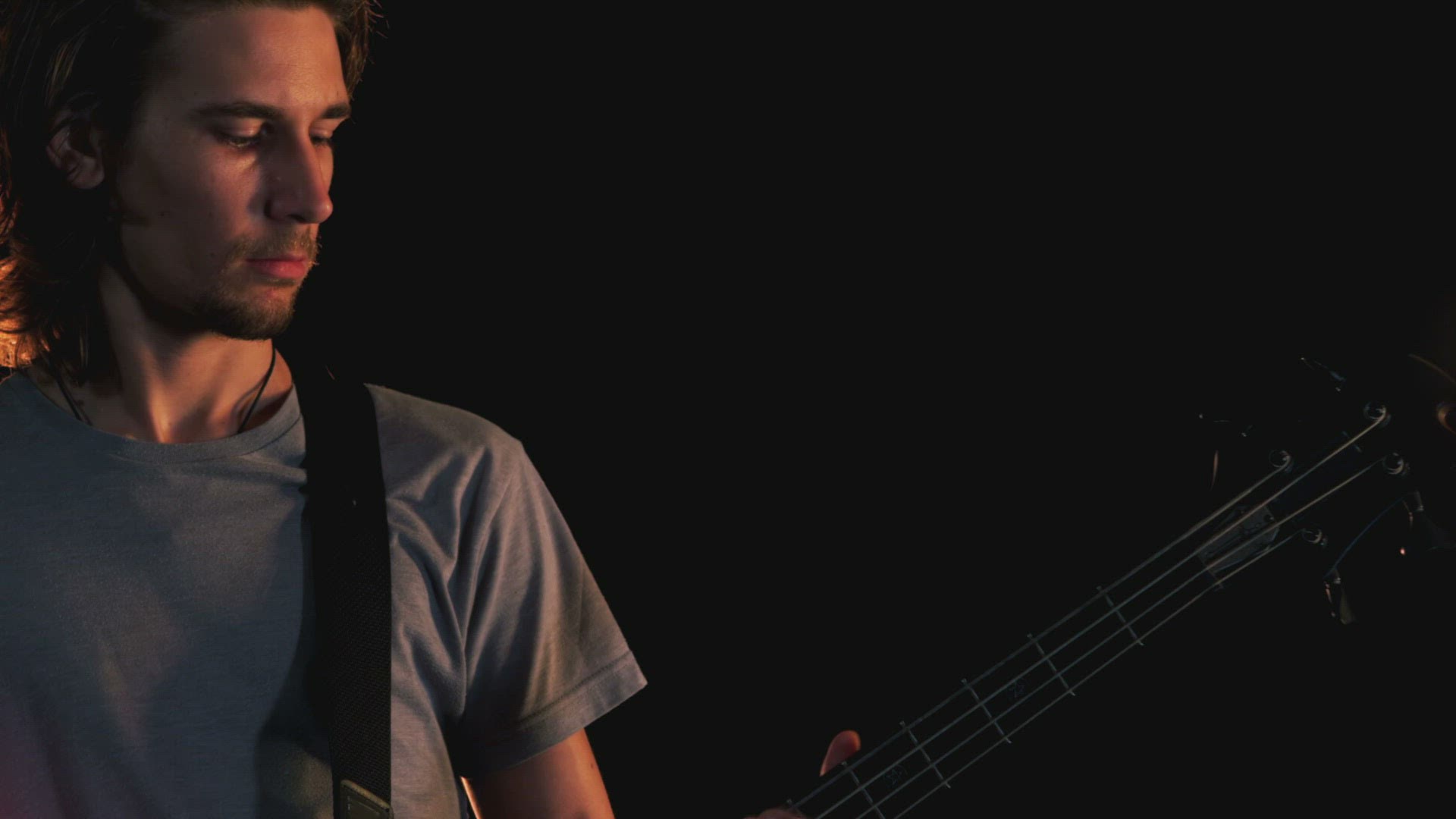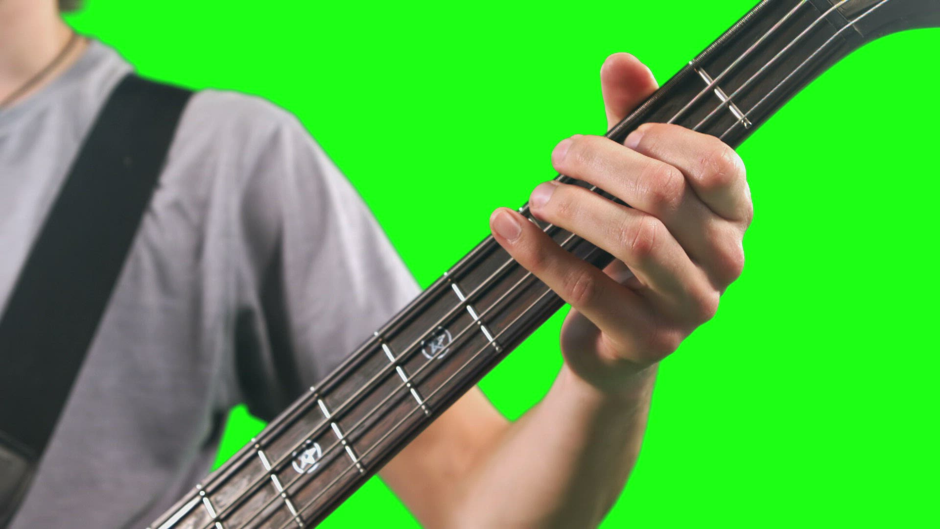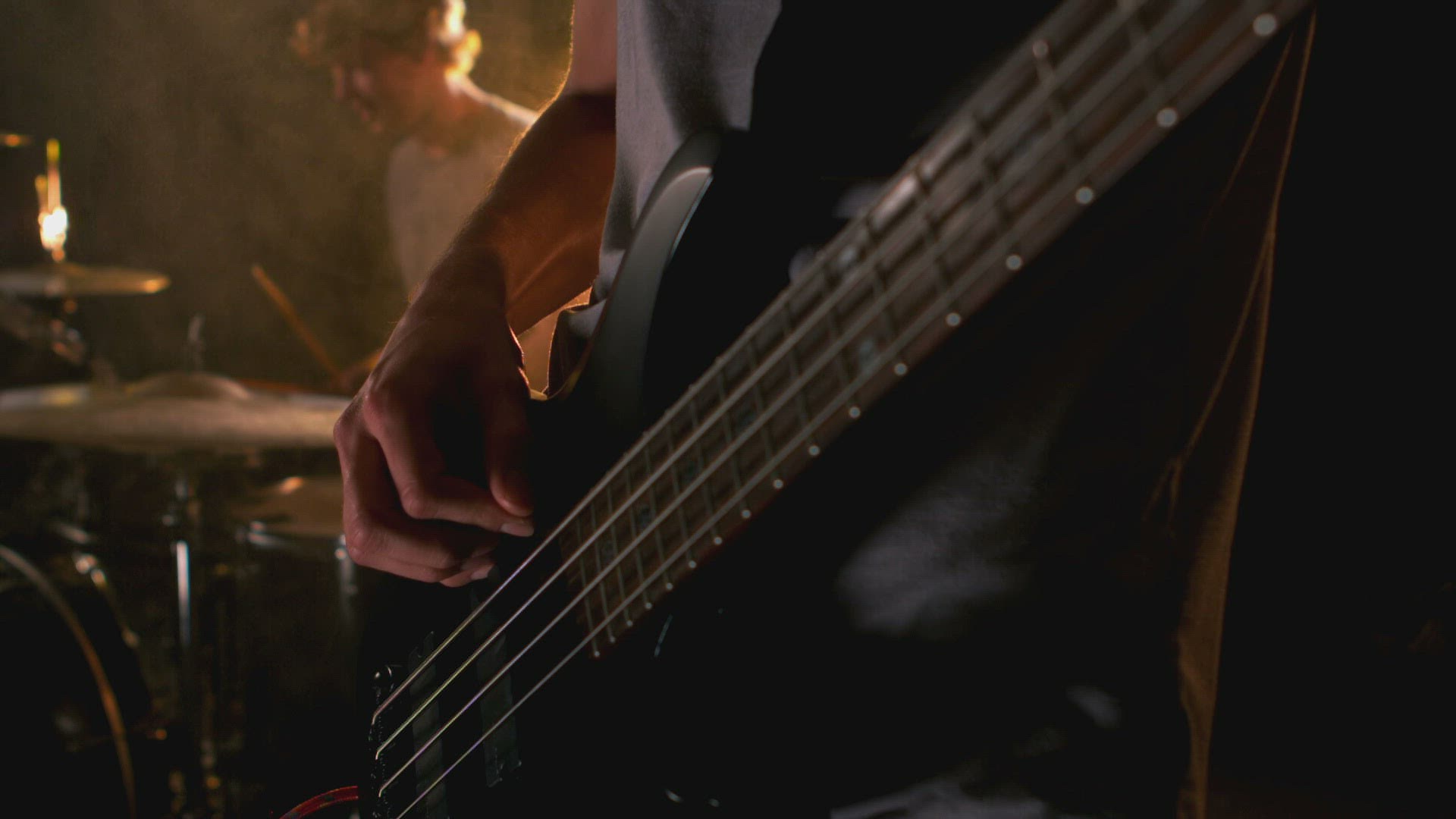 Handheld closeup A Latino bassist plays with a guitar head in the foreground.