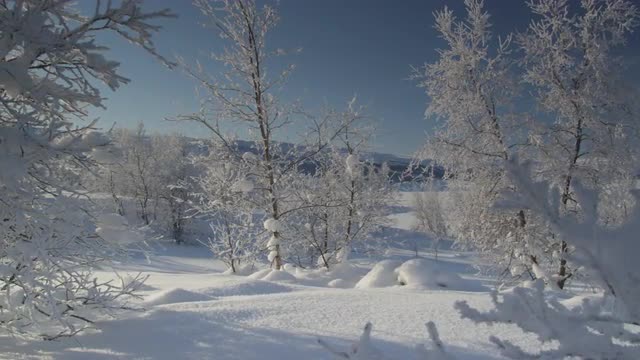 > A red winter sunset on snow covered mountains in Geilo, Norway.