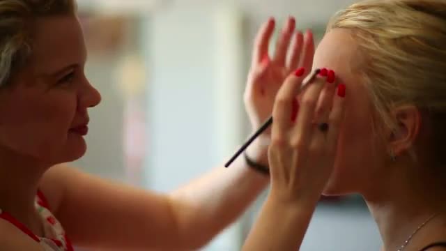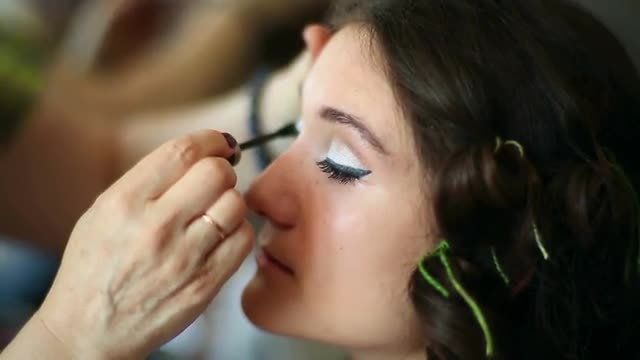 Makeup artist apply the cream on the eyelids model. Before photo session in studio.
