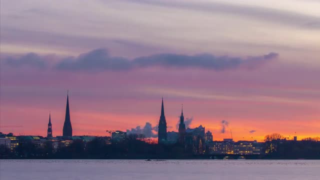 1063885 - Time lapse of colorful sunset behind Hamburg skyline and Alster