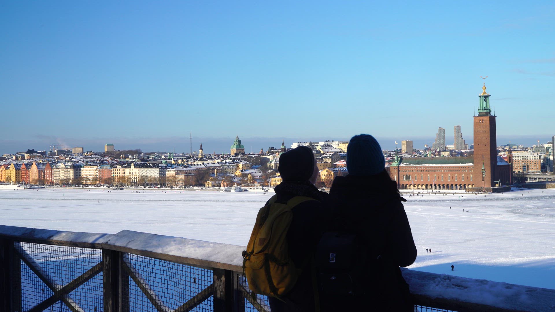 2222775 - silhouette of tourists standing at viewpoint watching out over city hall and central stockholm