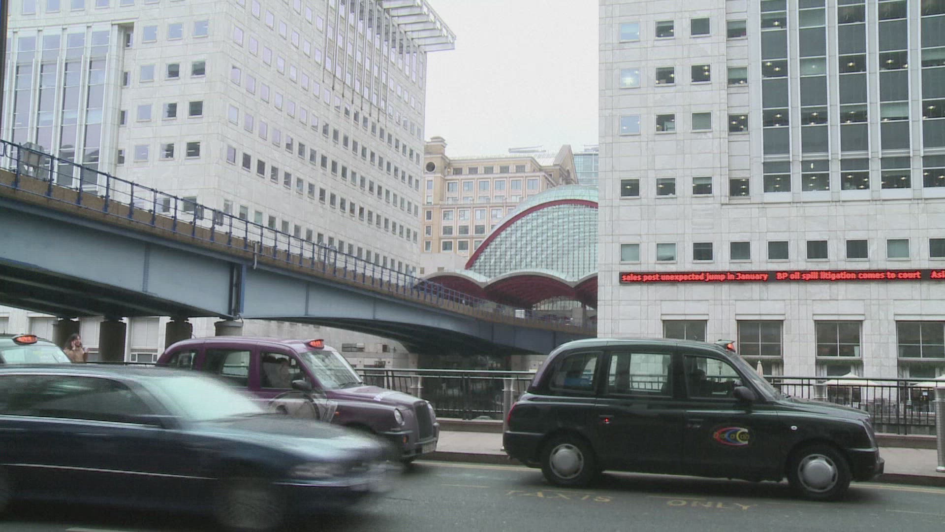 > London's Canary Wharf financial district seen from the East, looking up the River Thames.