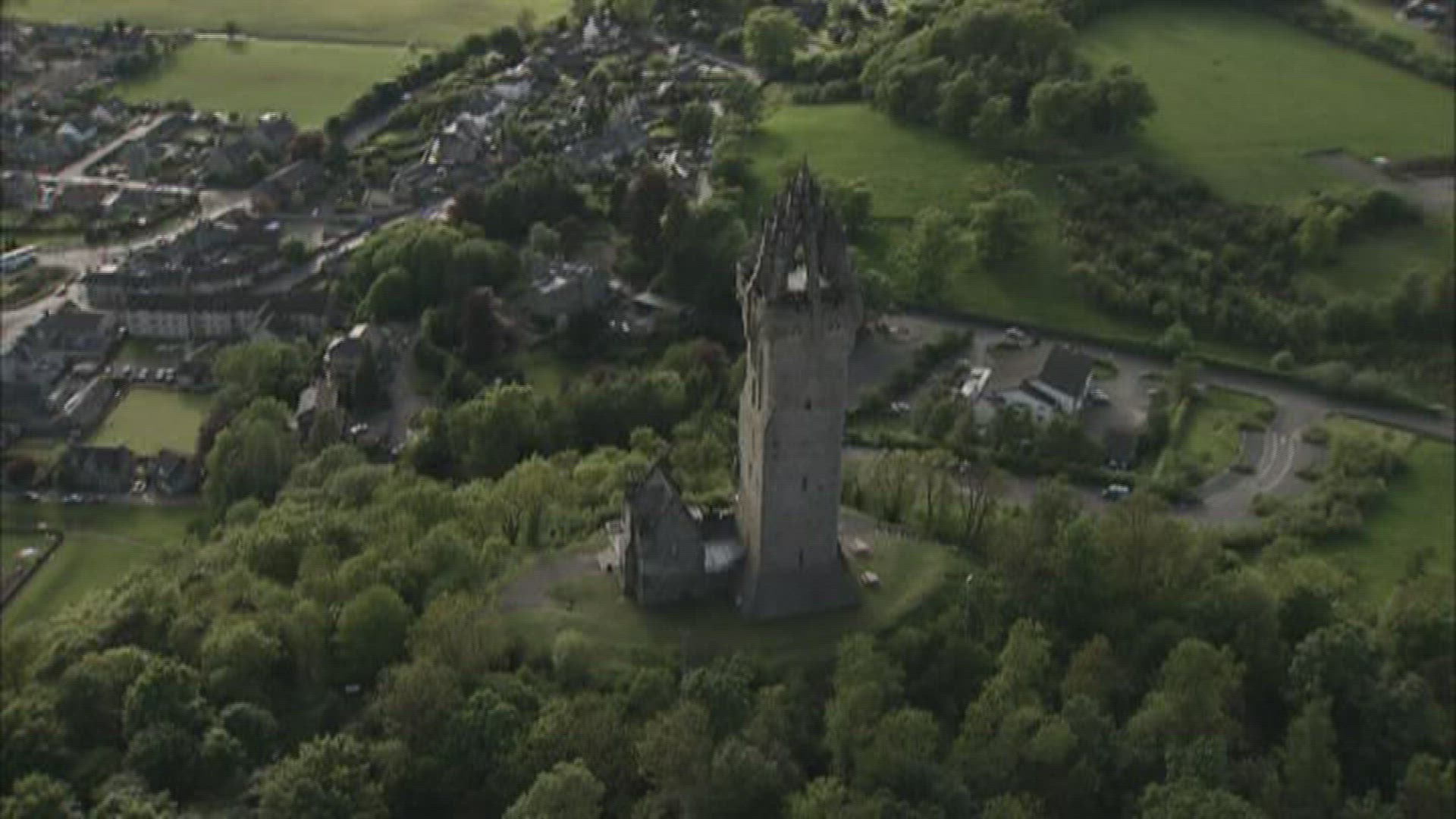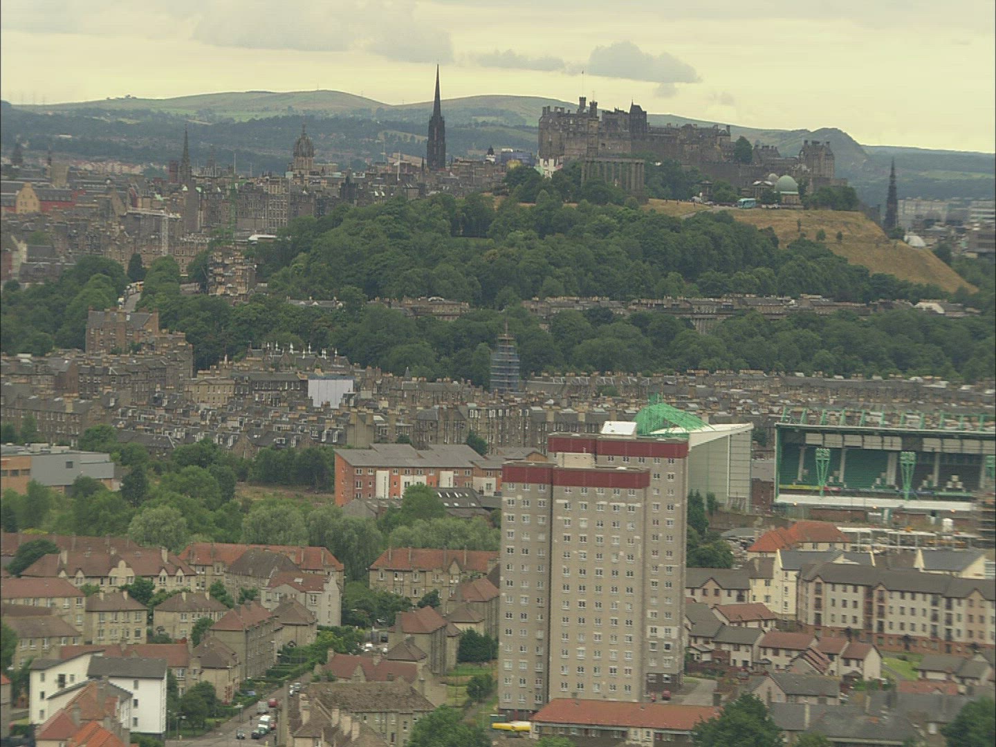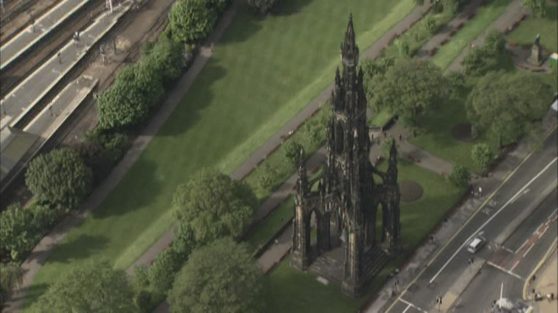 > The Balmoral hotel in Edinburgh with over hanging trees in foreground