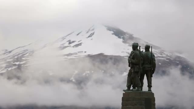 War memorial at Spean Bridge in the Scottish highlands with clouds, snow and mountains in the background