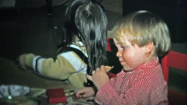 BOULDER, CO. USA - 1973: Siblings eating snack food in the romper-room dining table.
