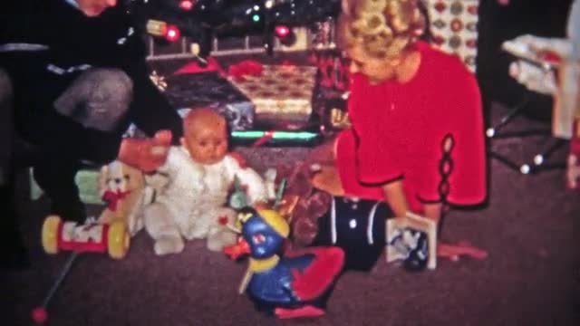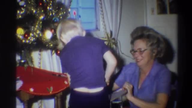 > BOULDER, CO. USA - 1973: Mom opens up the boy's racecar Christmas gift.