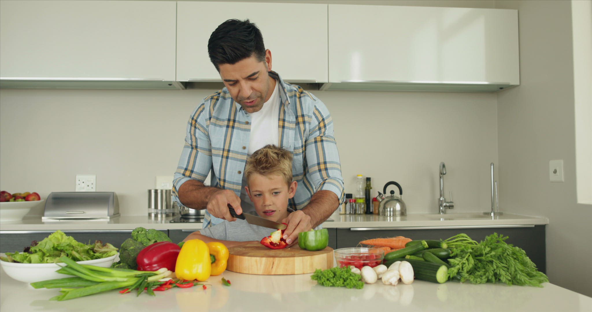 > BOULDER, CO. USA - 1973: Dad teaching son about how to carve a holiday turkey.