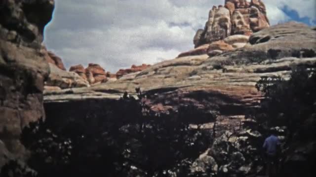> CANYONLANDS, UTAH -1971: Man hiking narrow canyon trails rock formations.