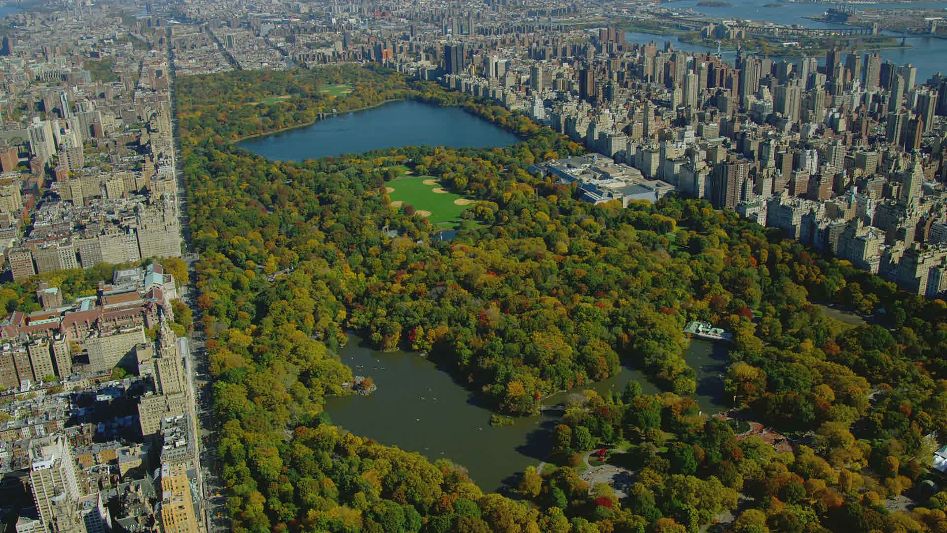 Revealing low altitude aerial shot of Midtown Manhattan from Central Park