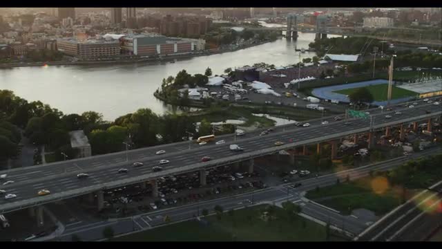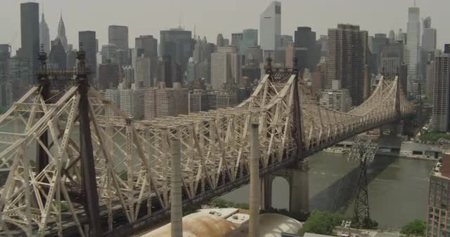 High altitude forward moving shot of New York City flying over bridge
