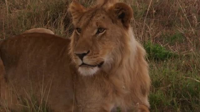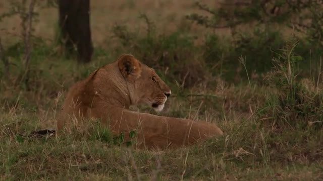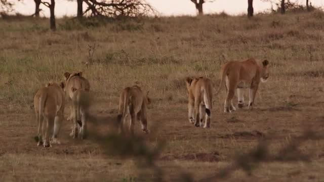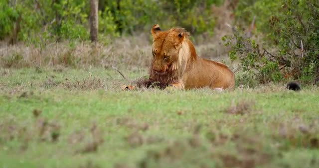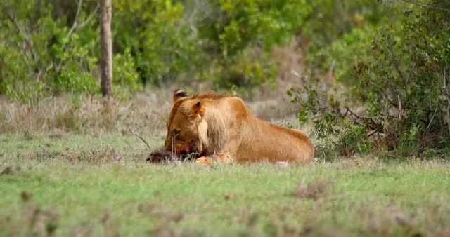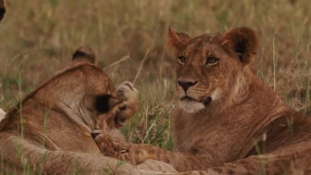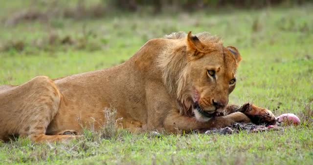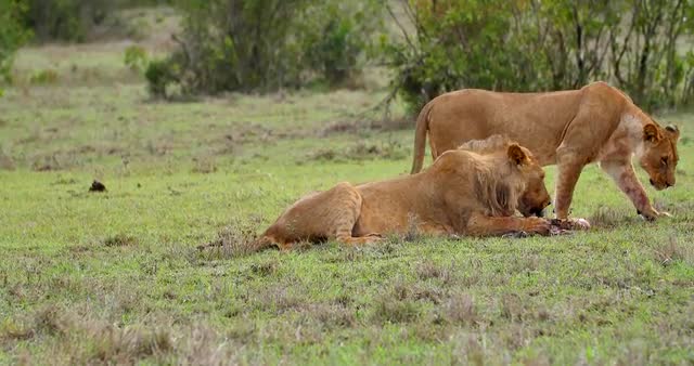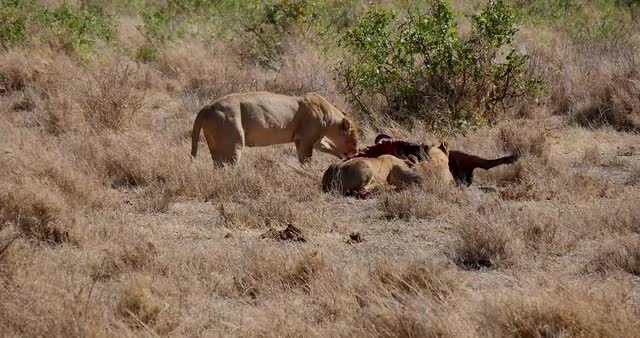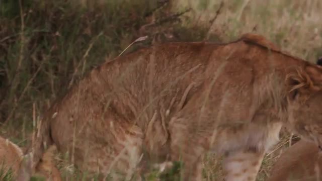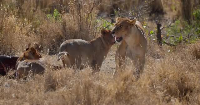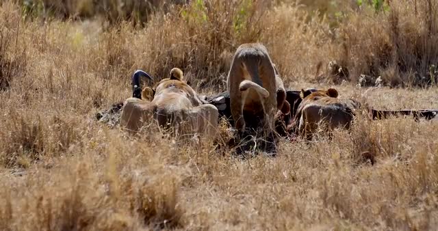 Lions in the Masai Mara National Reserve in Kenya on a feeding frenzy.