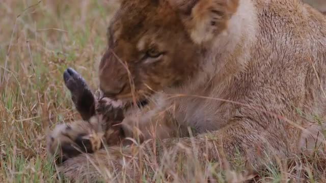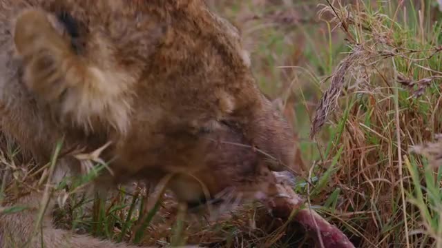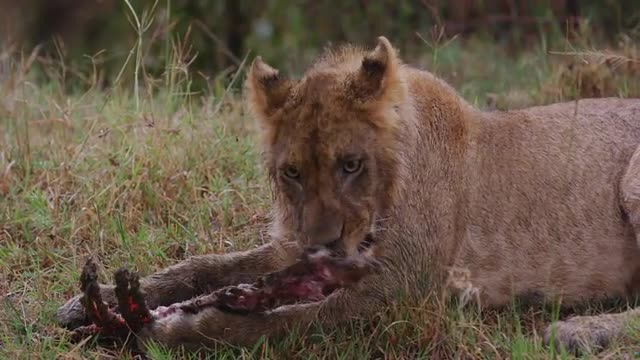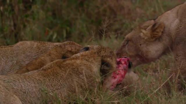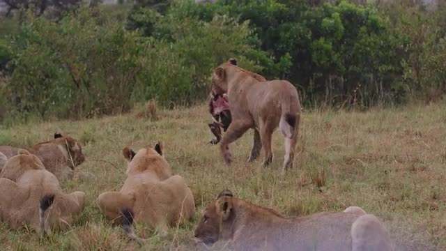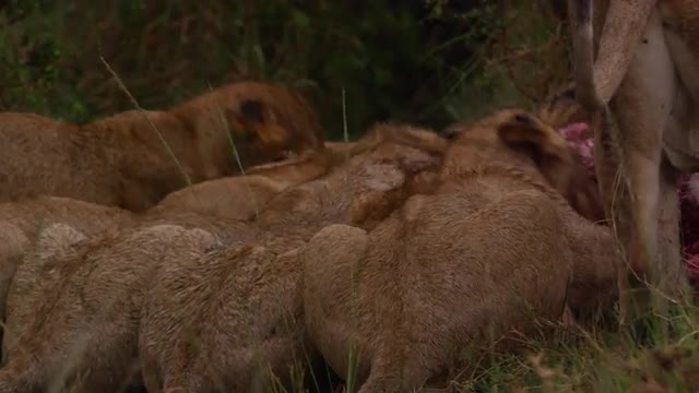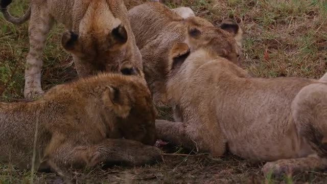 Lions in the Masai Mara National Reserve in Kenya on a feeding frenzy.