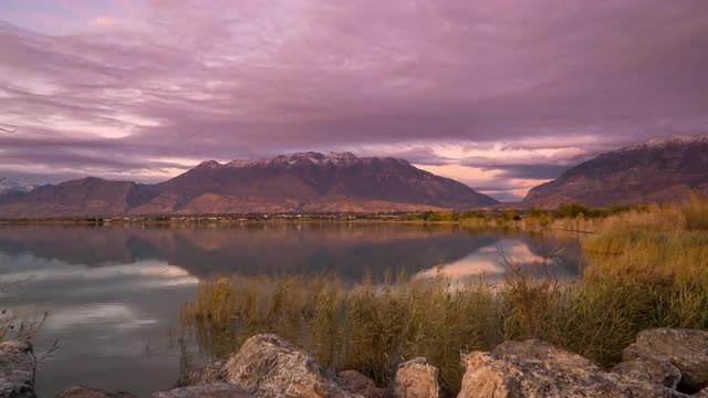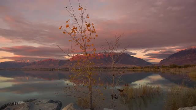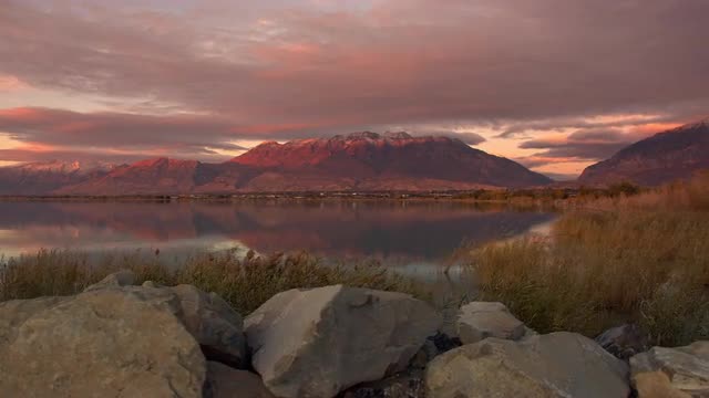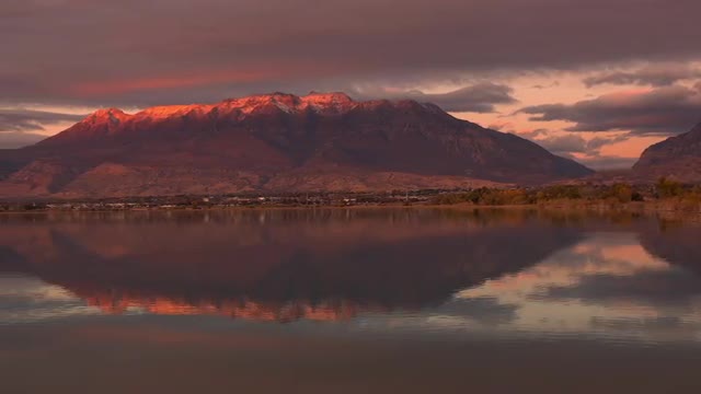 1091485 - Panning view of mountain reflection during sunset in Utah