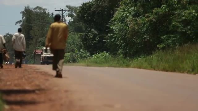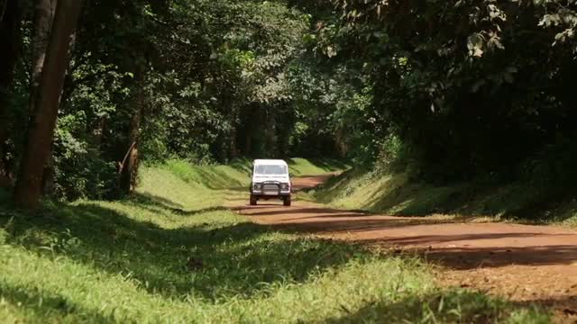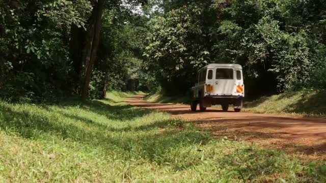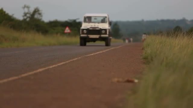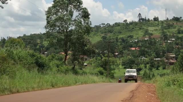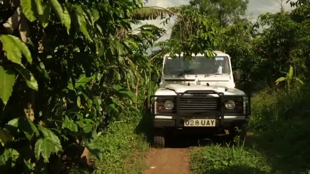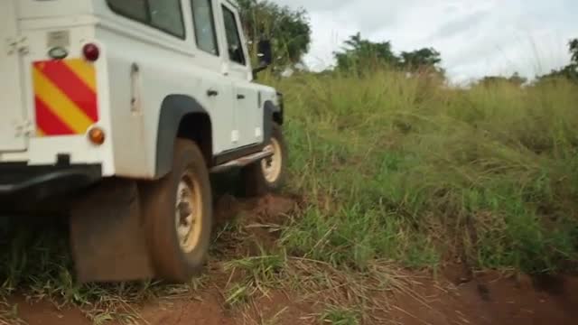 > A caucasian man and African man chat between to white Landrovers in rural Uganda, Africa