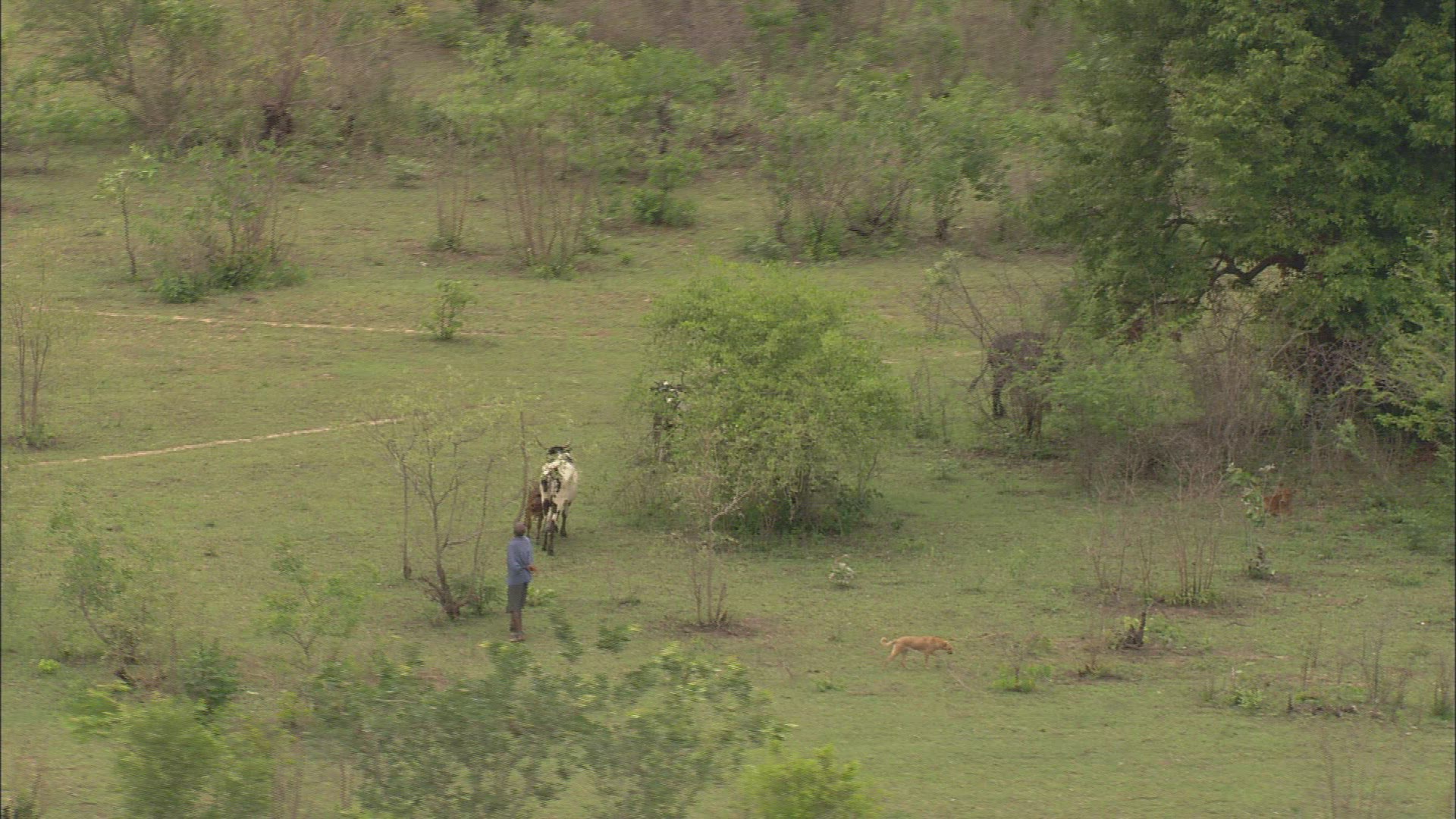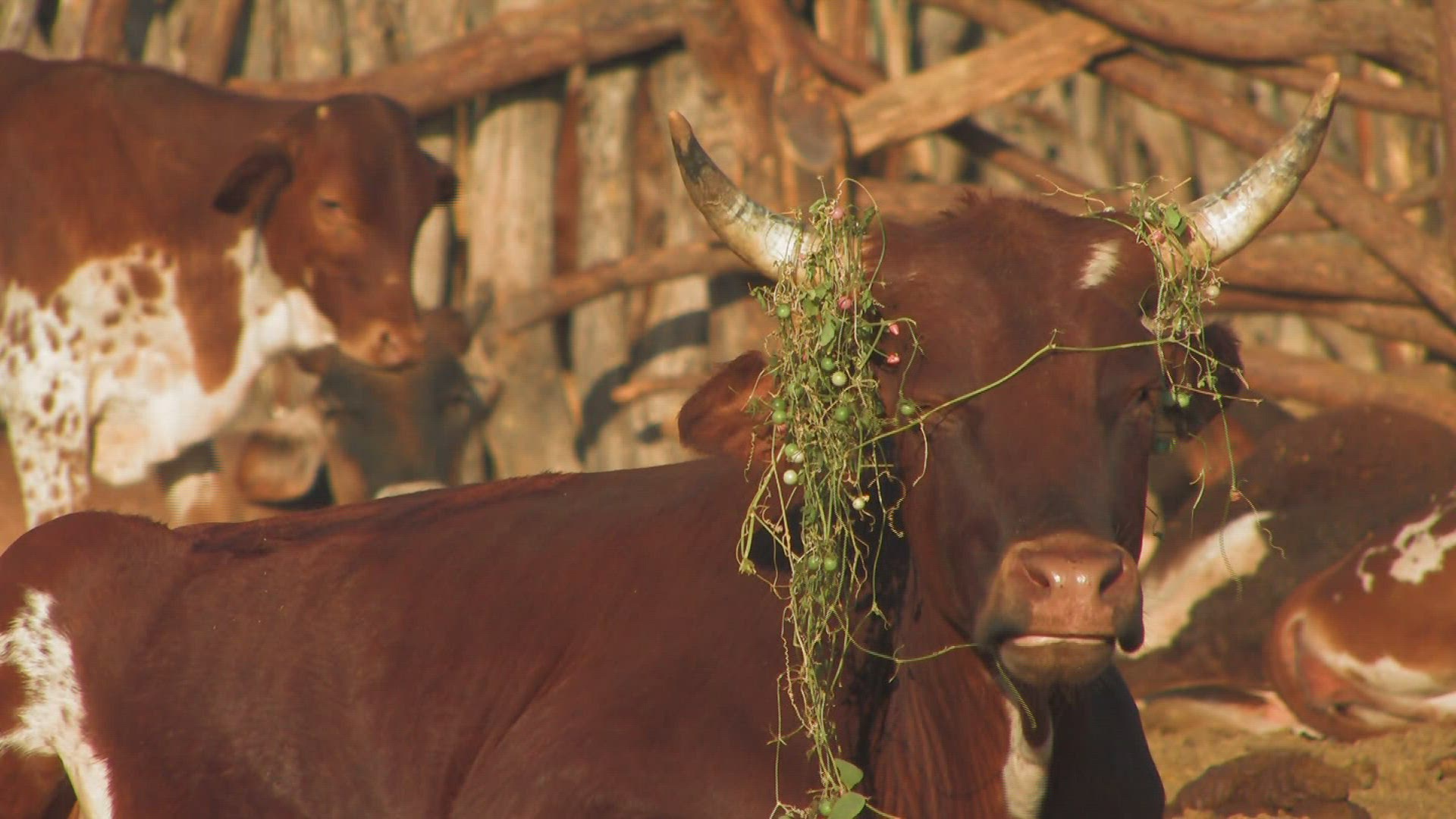 > Maasai Mara lady milking cow early in the morning with flies on cows nose