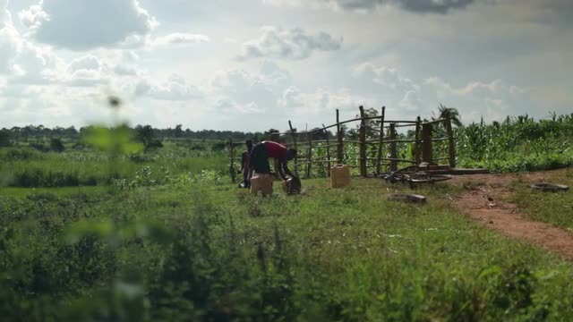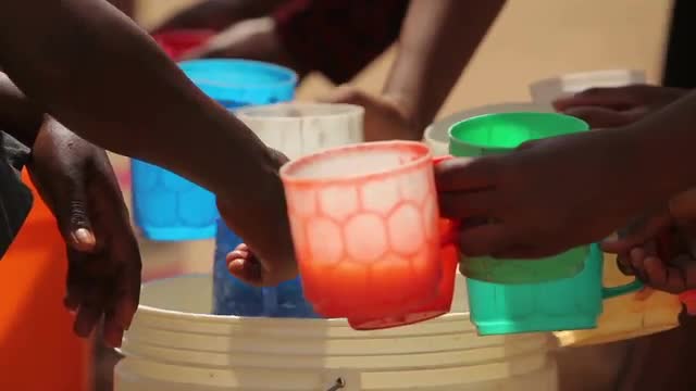 > Young African children drinking from large plastic cups
