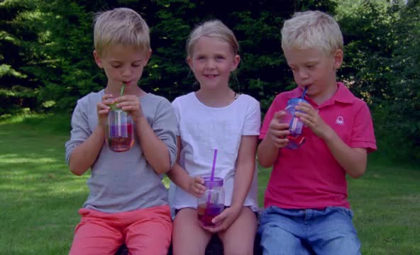 Young African children drinking from large plastic cups