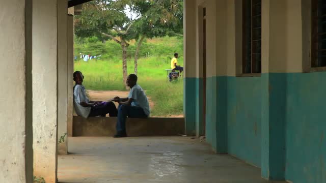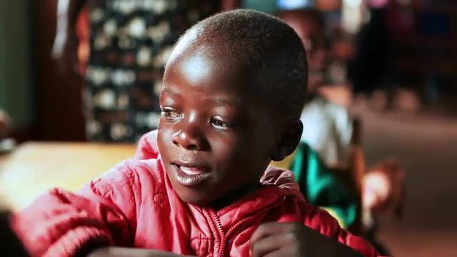 > Traditional Maasai teacher pointing at black board with chalk writing