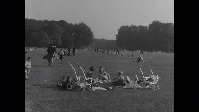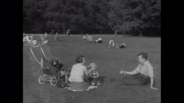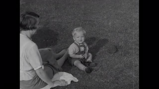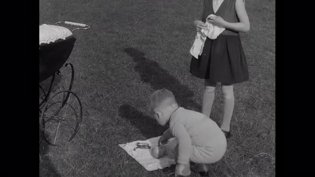 585164 - 1955: Storyland theme park petting zoo boy visits farm animals eating. GLEN, NEW HAMPSHIRE