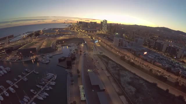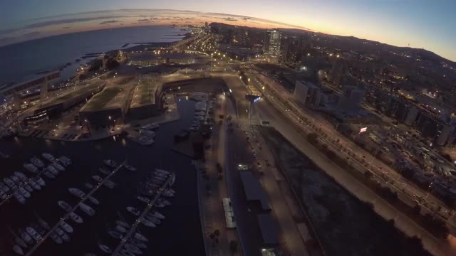 Drone Fly's over City Streets along coast line in Barcelona at night