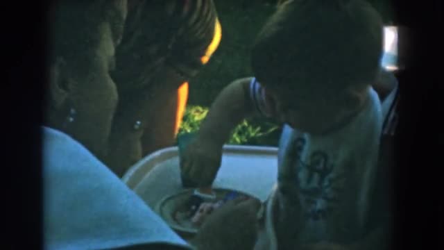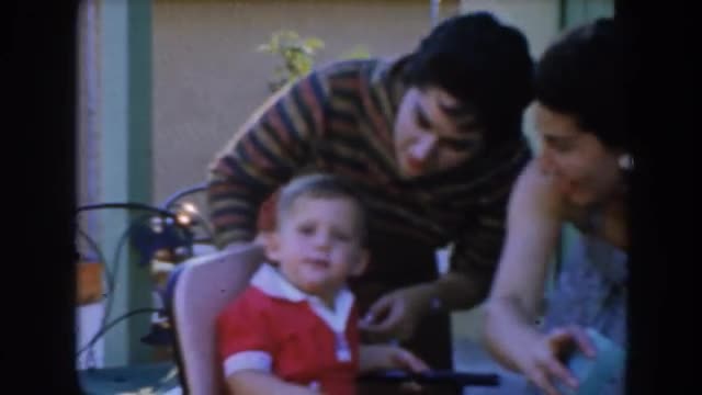 Mediam shot to slow dolly in, of a caucasian woman sitting in a chair by a stair rail holding a blind boy toddler in her lap.