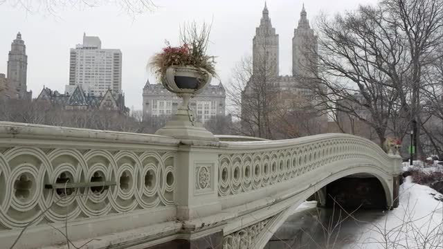 Slow motion pan to the left of the Bow Bridge in Central Park New York.