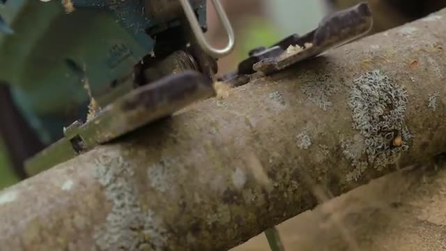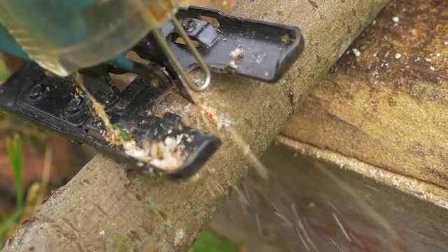 > Main in workshop using a metal chop saw cutting steel tubing with lots of sparks