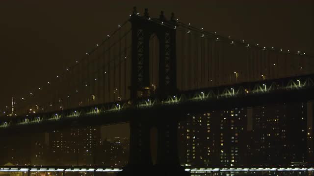 Static zoomed view at night overlooking the East River and the Manhattan Bridge.