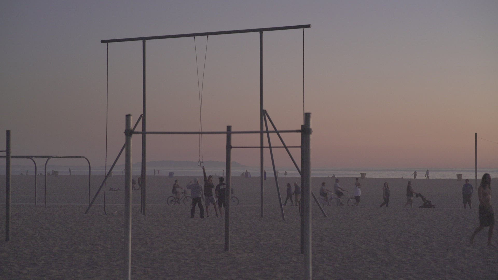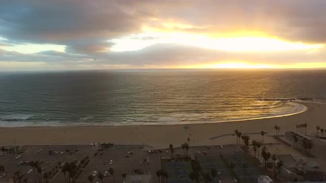 > Slow motion view of waves crashing on rocks at sunset with sailboat on horizon at Venice Beach.
