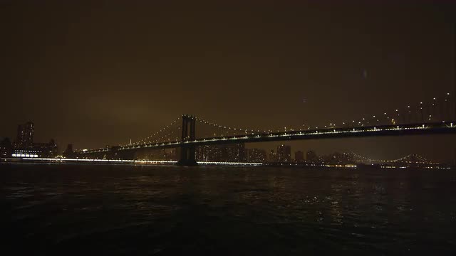 Static view at night overlooking the East River and the Brooklyn Bridge.
