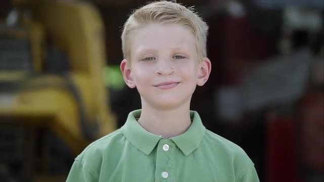 323149 - Slow motion push of boy with cleft lip standing in front of tractor.