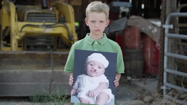 323153 - Slow motion of boy showing photo of himself as baby with cleft palate.