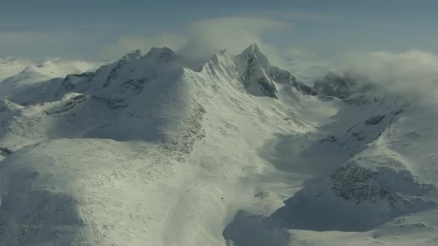 Aerial footage of the snowy mountains of Sunnmøre in Western Norway.