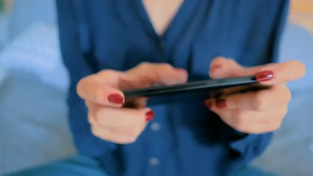 > Up close view of woman tapping on screen of smartphone.