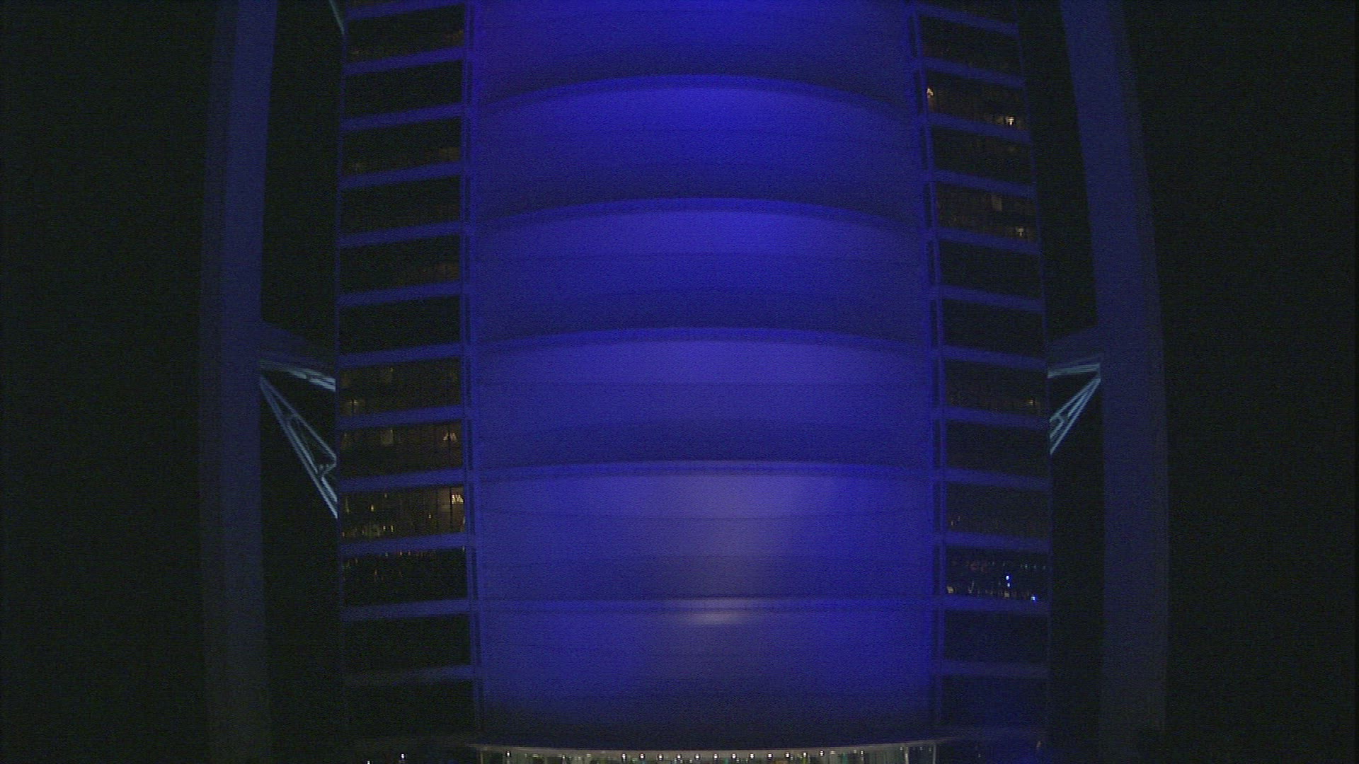 Crash pan (right to left) onto the Las Vegas Sign at night.