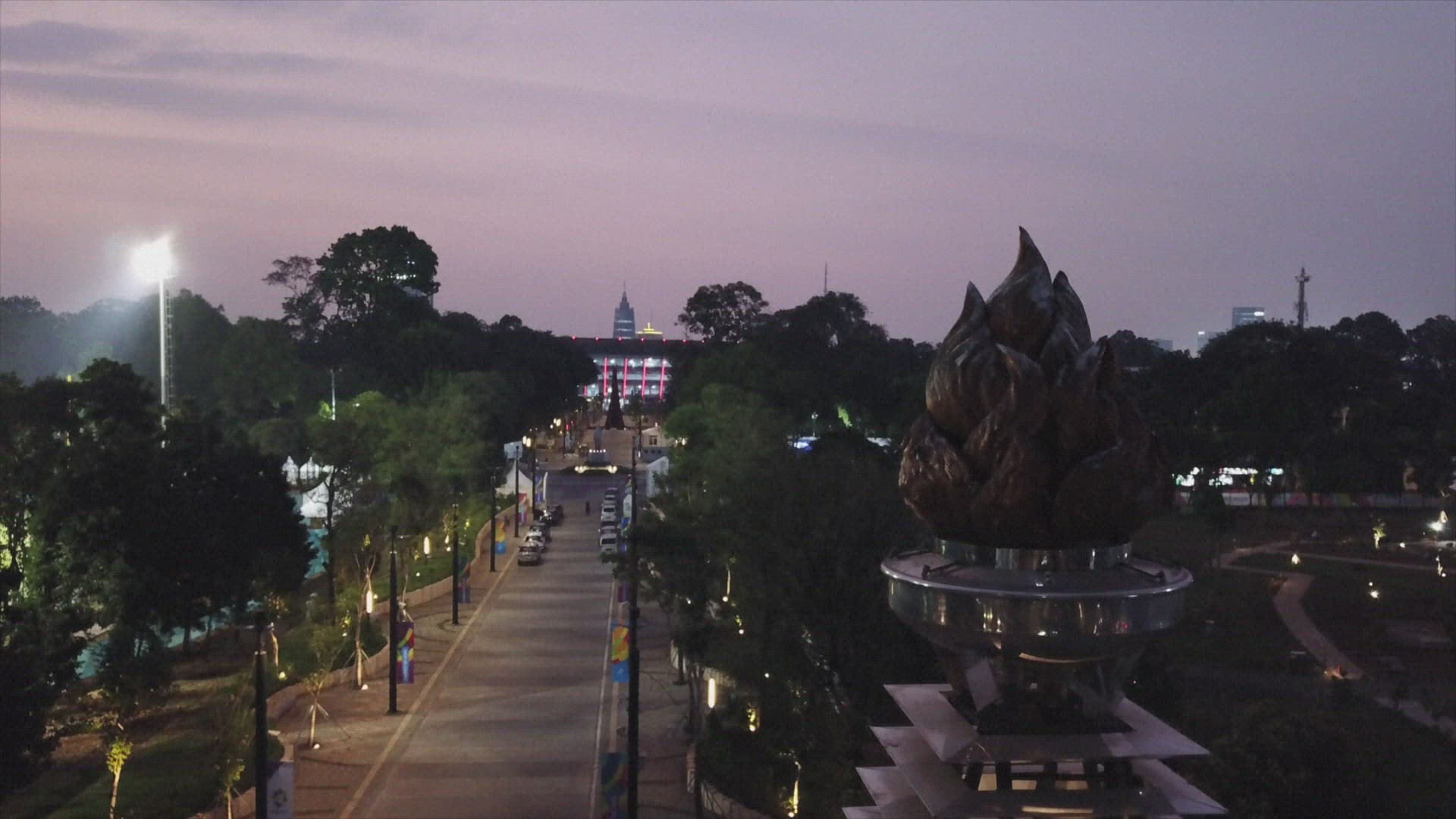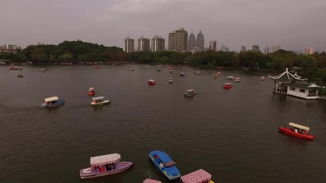 > Time lapse of boats floating by with towers in the back in Shanghai China, at sunset.