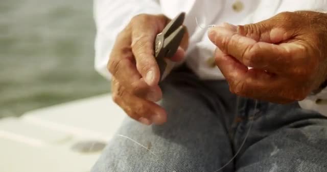 558662 - Caucasian fisherman tying a fly on skiff boat