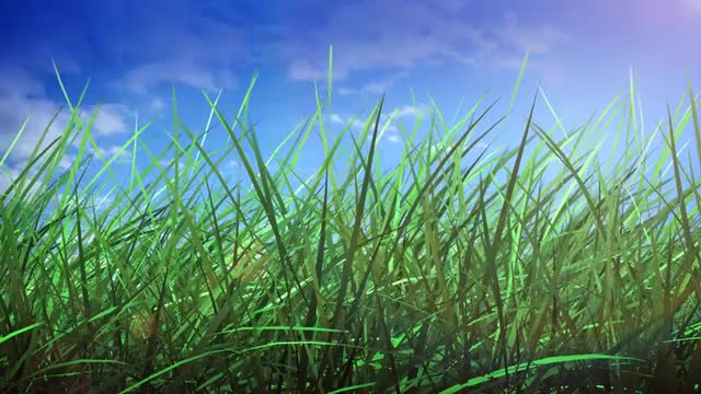 Timelapse traveling in the sky with bright sun and close-up of a curved green grass
