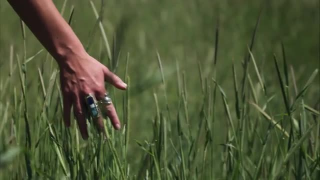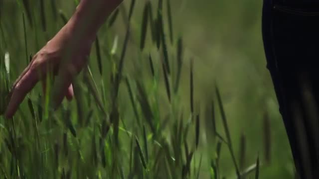 Slow motion of a woman's hand brushing through tall green grass. Filmed with a high speed camera.