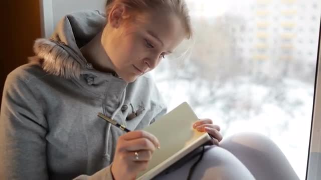 328836 - Up close slow motion of girl writing in book while mother strokes her hair.