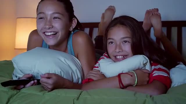 > Mixed race sisters watching television on bed