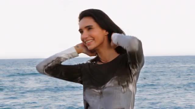 333676 - Hispanic woman dancing near ocean