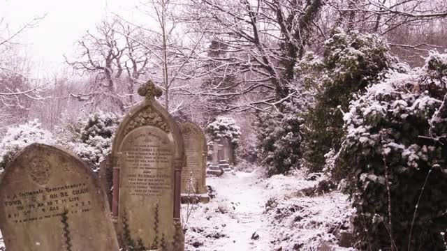 Snow falling in the Arnos Vale, Victorian Cemetery, Bristol.