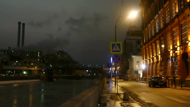 Cityscape at night with smoking chimneys.