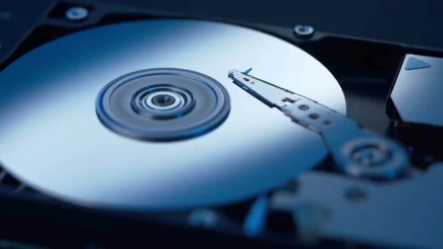 static macro shot of the inside of a modern computer hard disk drive with moving actuator arm reading and writing data from the platters