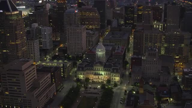 999240 - Baltimore, Maryland circa-2017, Aerial view of Baltimore City Hall at night. Shot with Cineflex and