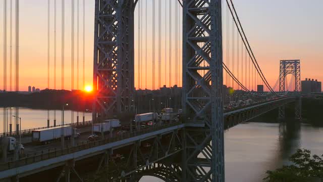 The sun rises as morning rush hour traffic on the George Washington Bridge crosses the Hudson River between New Jersey and New York.