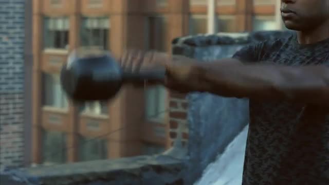 > Cinematic pan of Intense athlete doing kettlebell swings